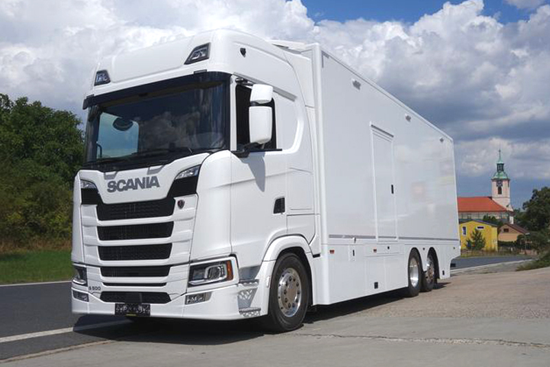 Skříňová nástavba je postavena na podvozku SCANIA S500.