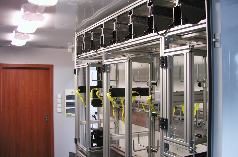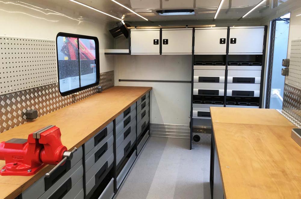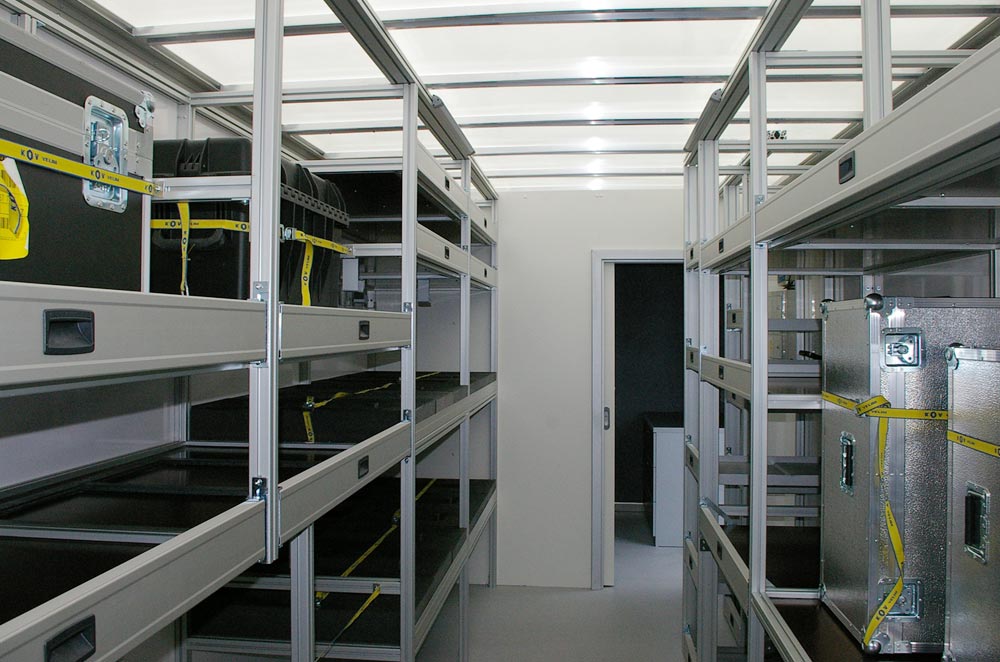 Vnitřní vybavení zahrnuje speciální dílenskou vestavbu jejiž součástí jsou například: Posuvné svěráky, výsuvné zásuvky s nosnotí 150kg na kotouče, výsuvný box na 32ks kompeltních tlumičů a další. Spodní schány ukrývají předevší elektrocentrálu o výkovu 12kVA.