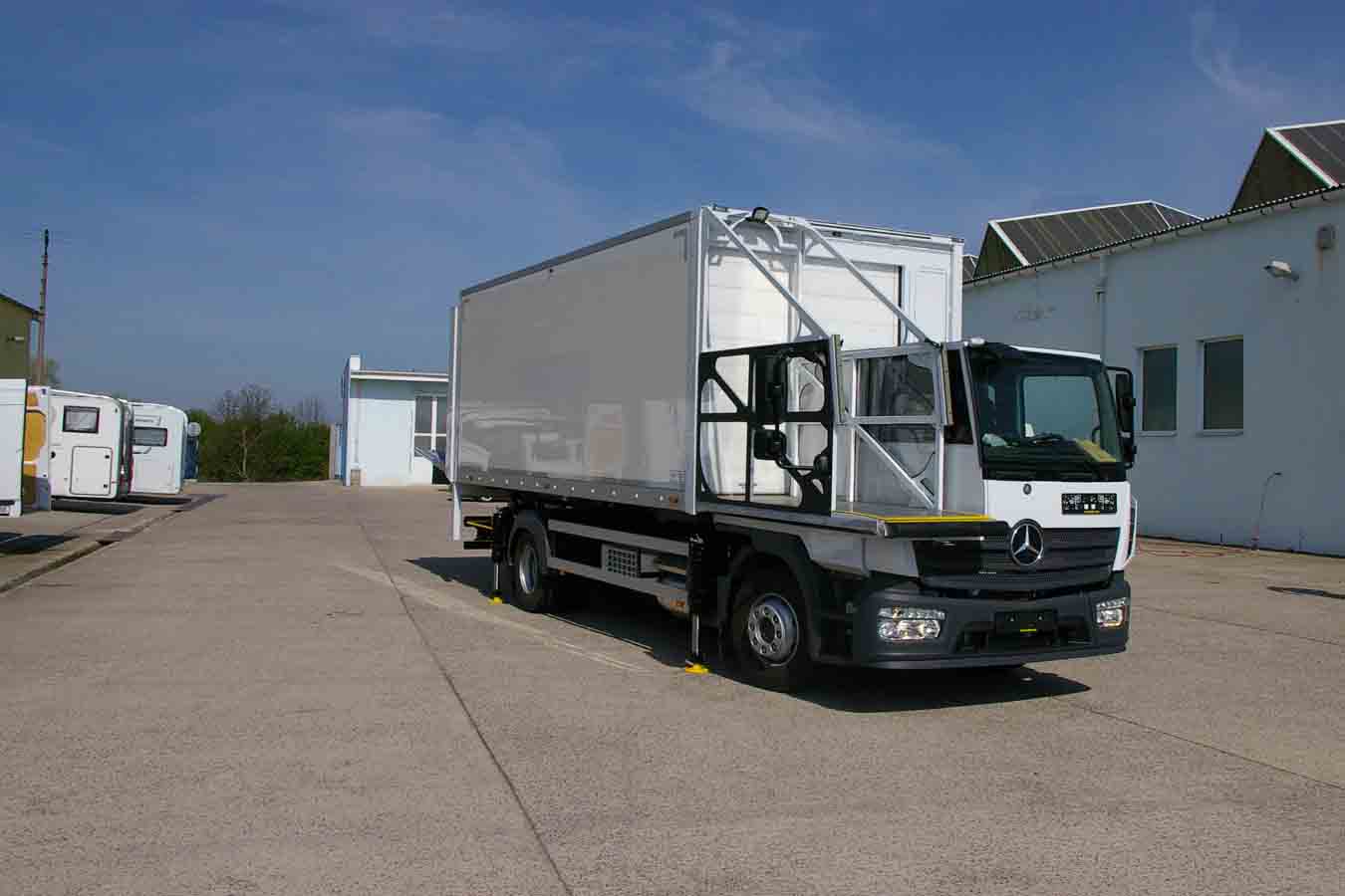• The basis of the superstructure is a steel scissor mechanism, which carries the distribution frame of the box isothermal superstructure and the auxiliary frame of the front loading platform. The stabilization of the vehicle during work is ensured by four hydraulic support legs..